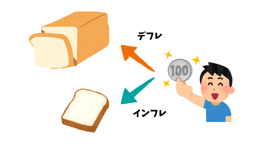 🔵 デフレ(物価下落)モノの値段が下がるお金の価値が上がる(買える量が増えるが経済が停滞)