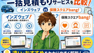 自動車保険を見直したい方必見!インズウェブと保険スクエアbang!の一括見積もりサービスを徹底比較。入力はたった3分で、最大20社の保険料を一括チェック。初心者にもやさしく解説します。